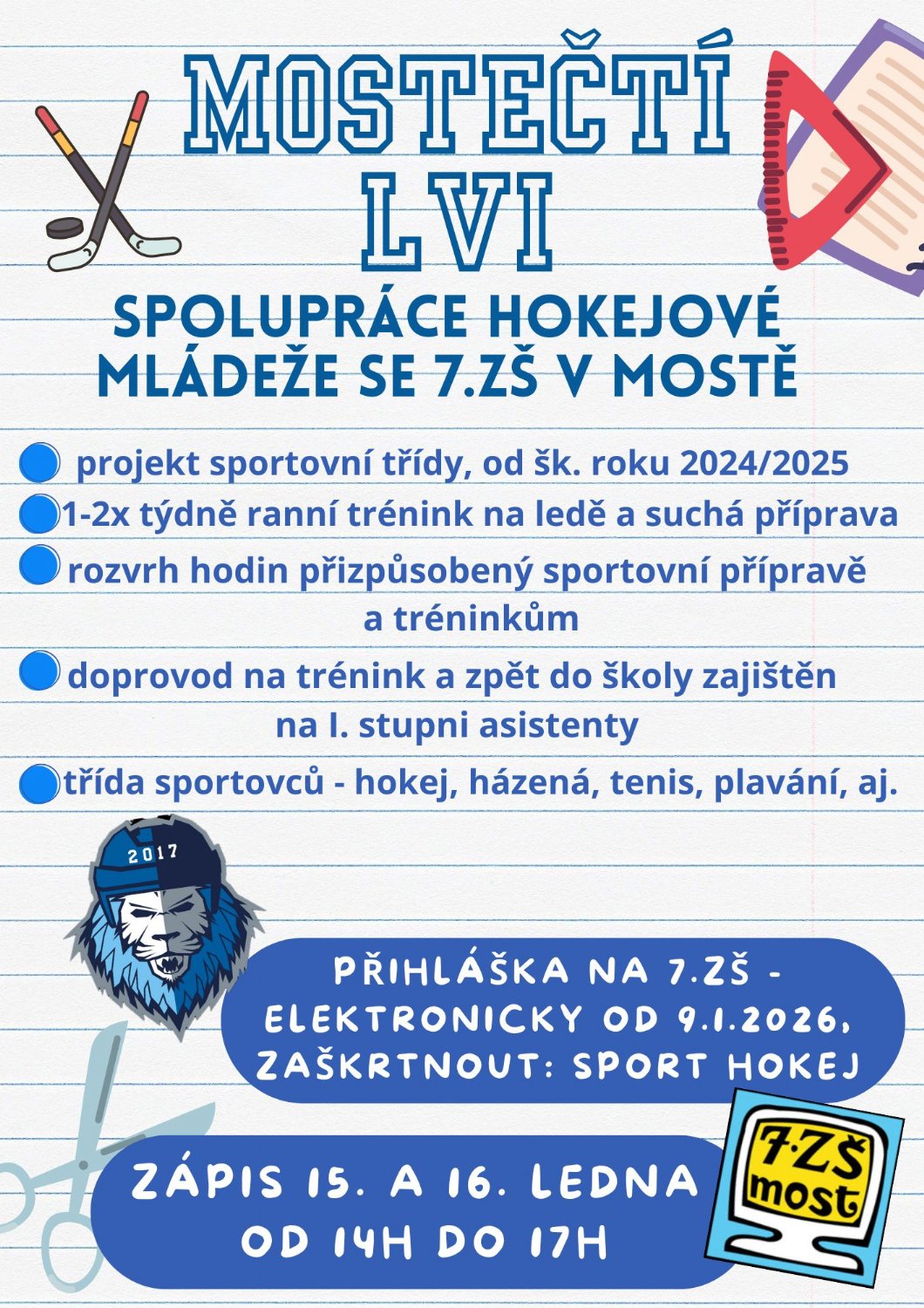 PŘIHLÁŠKA NA 7. ZŠ– elektronicky, zaškrtnout: sport hokej (MOSTEČTÍ LVI).